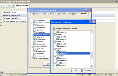 Для пользователя можно разрешить или запретить доступ (просмотр, добавление, изменение или добавление) к любому журналу, полю, документу и т.д. Можно поставить ограничение на отображаемую информацию. Любые настройки можно выделить в «возможности» и «раздать» их пользователям, такая схема существенно сокращает время добавления и настройки прав пользователей. Контроля над тем, кто, когда и какую информацию добавил, изменил или удалил (рис. 1).